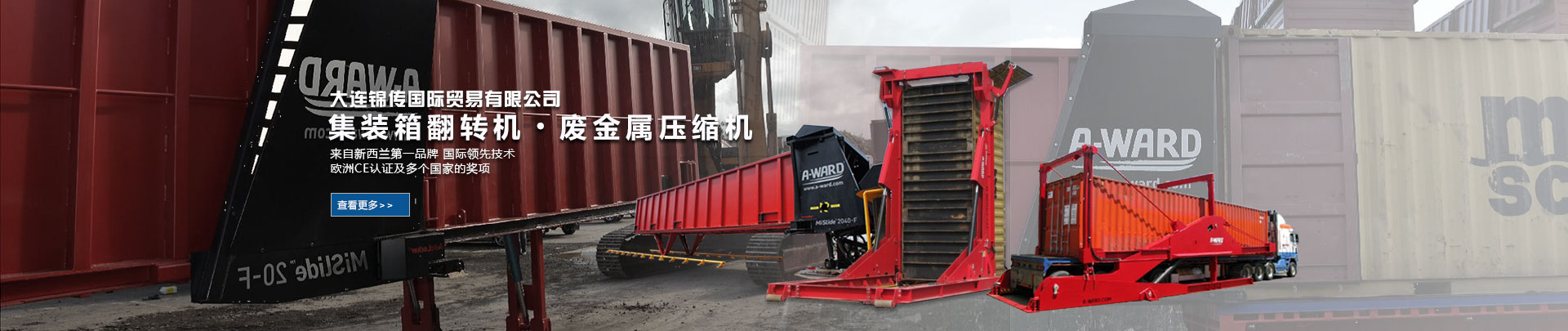 大連錦傳國際貿易有限公司于2013年11月與新西蘭A Ward公司達成戰略合作,成功代理集裝箱翻轉機、廢金屬壓縮機等產品在中國大陸的銷售、維護及保養業務。本公司重合同、守信用,保證產品質量,以經營多種特色的產品和薄利多銷的原則,贏得了廣大客戶的信任與厚愛。現長期出口產品至澳大利亞,巴西,德國,俄羅斯,哥倫比亞,美國,泰國,羅馬尼亞,新西蘭 ,意大利,越南,印度,印度尼西亞等國家。